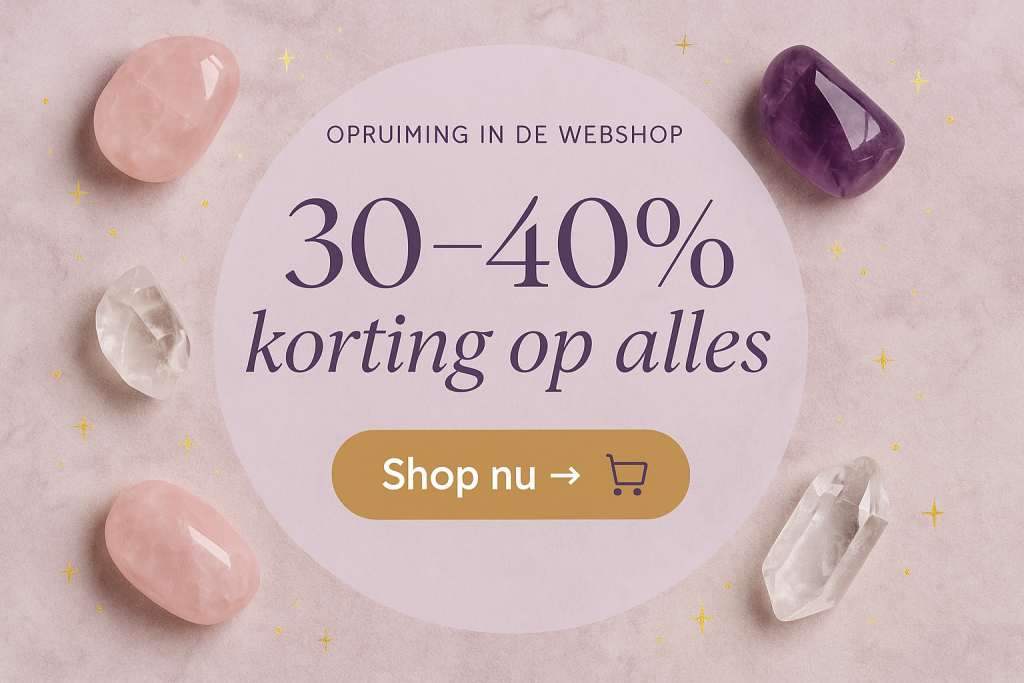 Alles is tijdelijk 30–40% afgeprijsd. Dat maakt dit hét moment om dat ene stuk waar je al een tijdje naar keek in huis te halen, of een nieuw kristal te ontdekken dat bij je past.